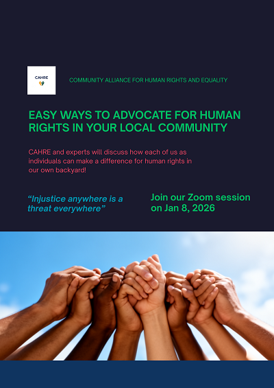 Read more: [Join our zoom Session] Easy ways to Advocate for human rights in your local communityReady to turn your passion for justice into real-world impact? Join CAHRE’s upcoming Zoom session to discover easy actionable, proven ways to advocate for human rights in your own backyard. Don’t just watch from the sidelines – learn how to lead and build a fairer community! Event details are as follows: Access information: