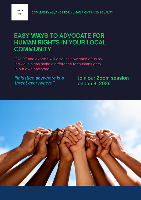 Ready to turn your passion for justice into real-world impact? Join CAHRE’s upcoming Zoom session to discover easy actionable, proven ways to advocate for human rights in your own backyard. Don’t just watch from the sidelines – learn how to lead and build a fairer community!